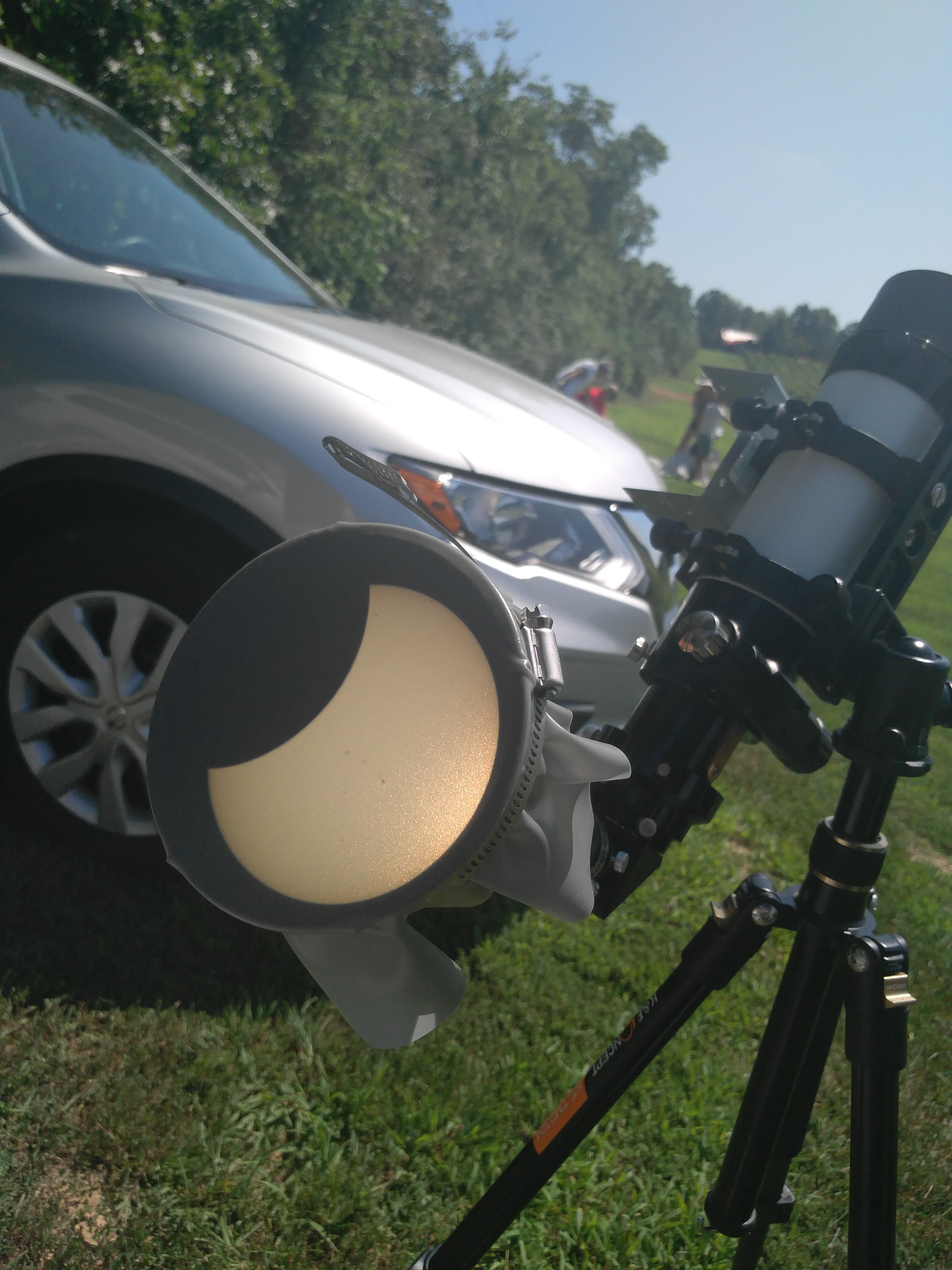 这真是一片不错的地方!酒庄四周是一大片草坪,一个平静的小湖,一片葡萄园。许多看日食的人们来到这里,乐队在演奏,时不时有人们鼓掌,音乐飘荡在整个酒庄。有些炎热,我们停完车以后,把野餐和日食的设备搬出来,铺好、架好,开始等待日食的到来。