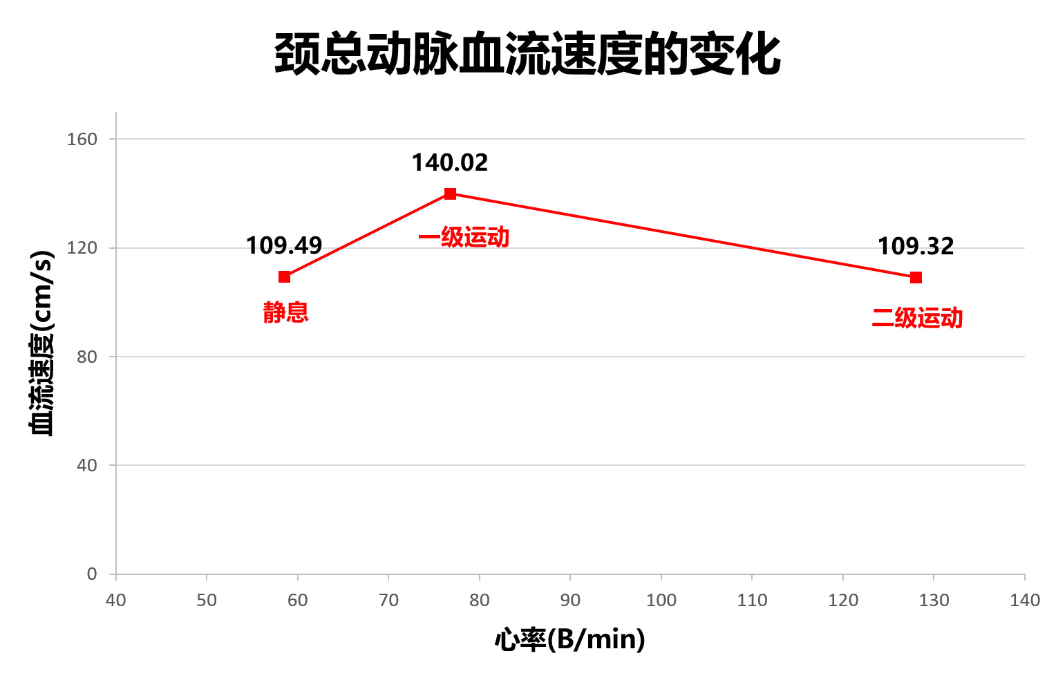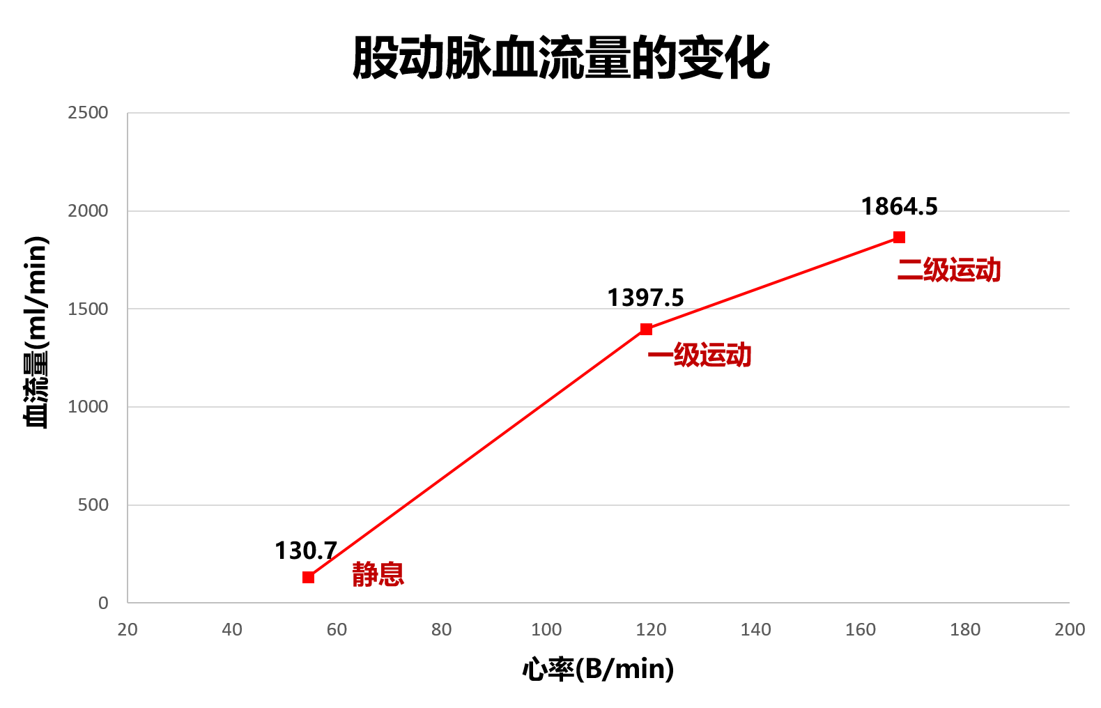 运动时人体血流分布发生改变,这一点我们最初是没把握的。所以做出这样的结果我们也很开心。尤其是股动脉血流量,一级运动几乎是静息时的10倍,而颈总动脉的血流量也是明显较少。可见在运动时,人体主要保证的是骨骼肌的供血,而大大减少了对头部的供血。