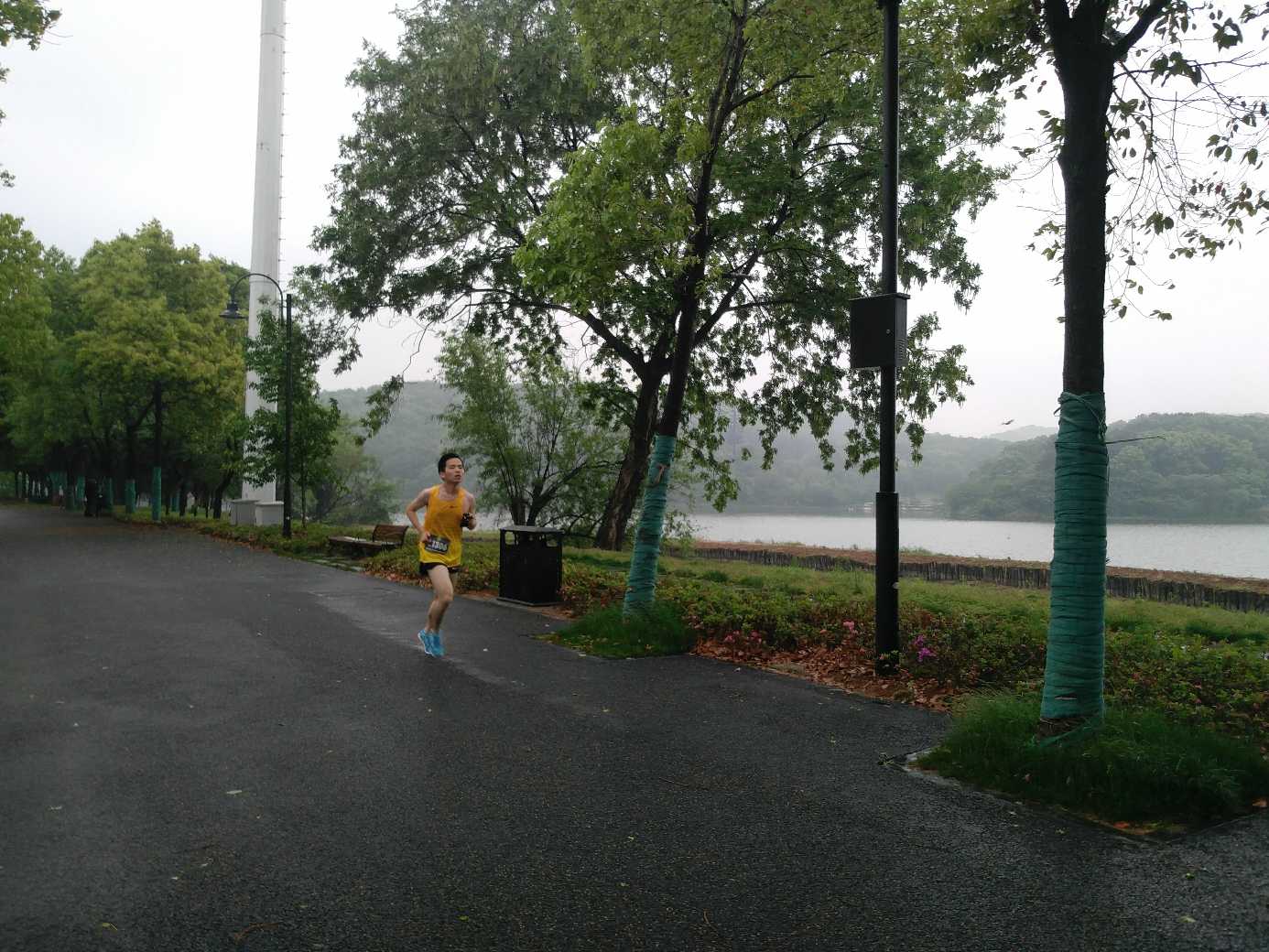 我从终点开始,给路过的选手拍照,主要想拍我们学校的队员,不过由于一圈4.2公里,大概要15~18分钟,大部分时间比较无聊。因此就随便走走,拍拍风景,在群里汇报一下目前的情况,看看那个学校领先。偶尔给路过的同学喊喊加油,报报名次。我发现华科的喻家湖风景真不错,青山绿水的,赛道也很适合跑步。我很享受雨后凉爽的天气下,赛后放松的心情下,在赛道上一个人闲逛拍照的时光。总算是出来一趟,没有一直处在被赶鸭子上架的情况。