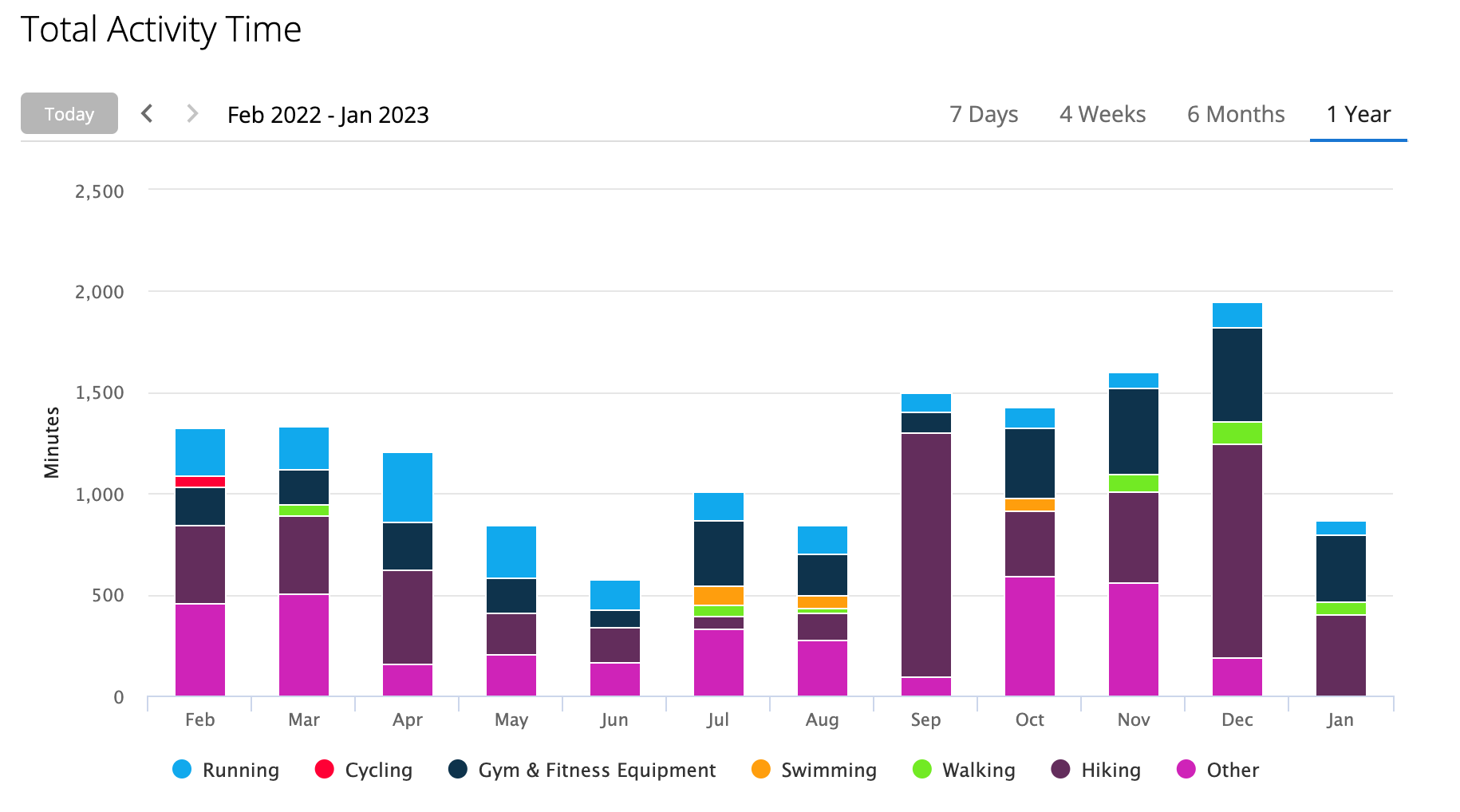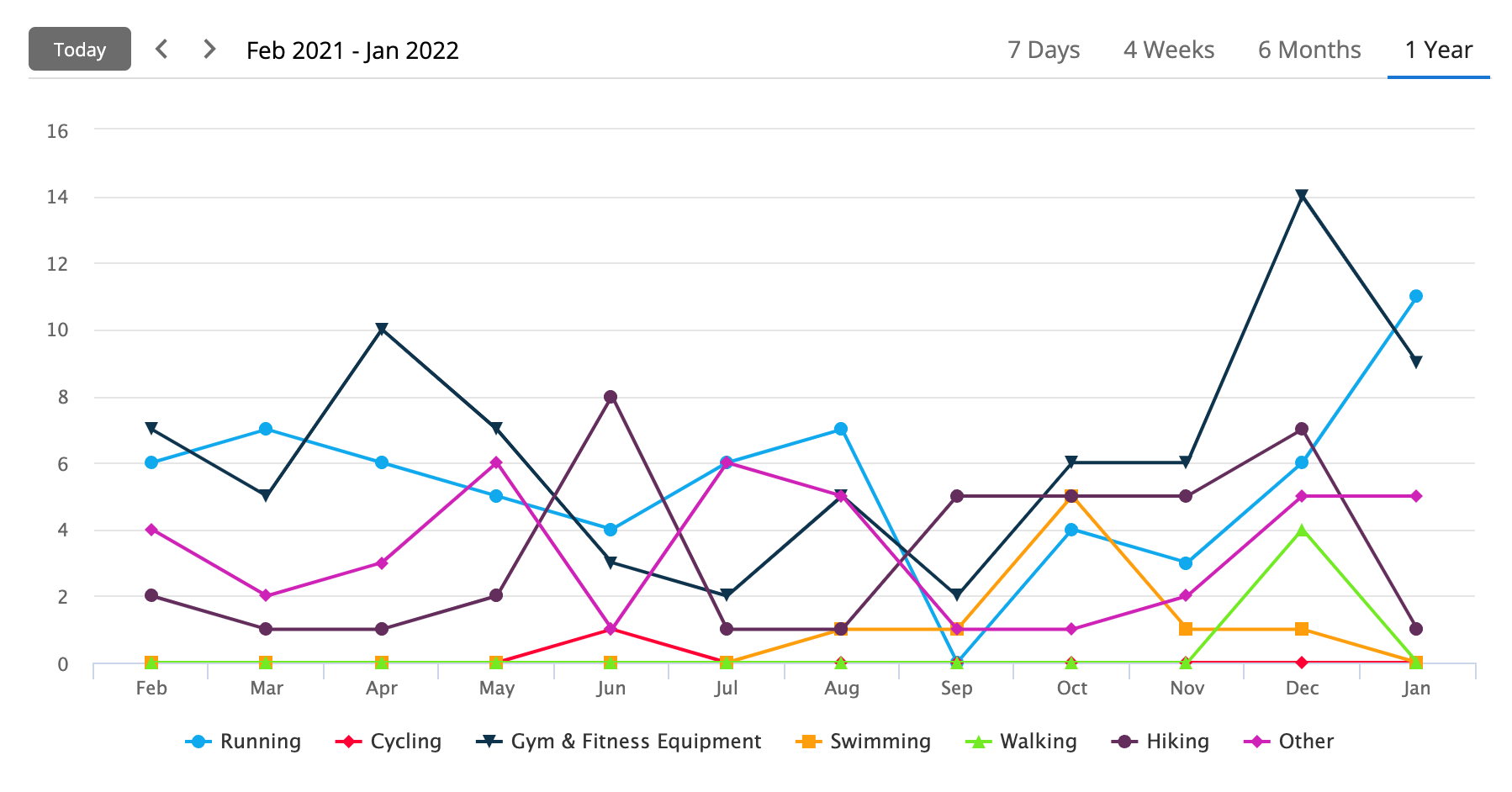 - 2022年,Gym & Fitness 运动次数最多,原因是经常去 UCI 健身房跳操上课