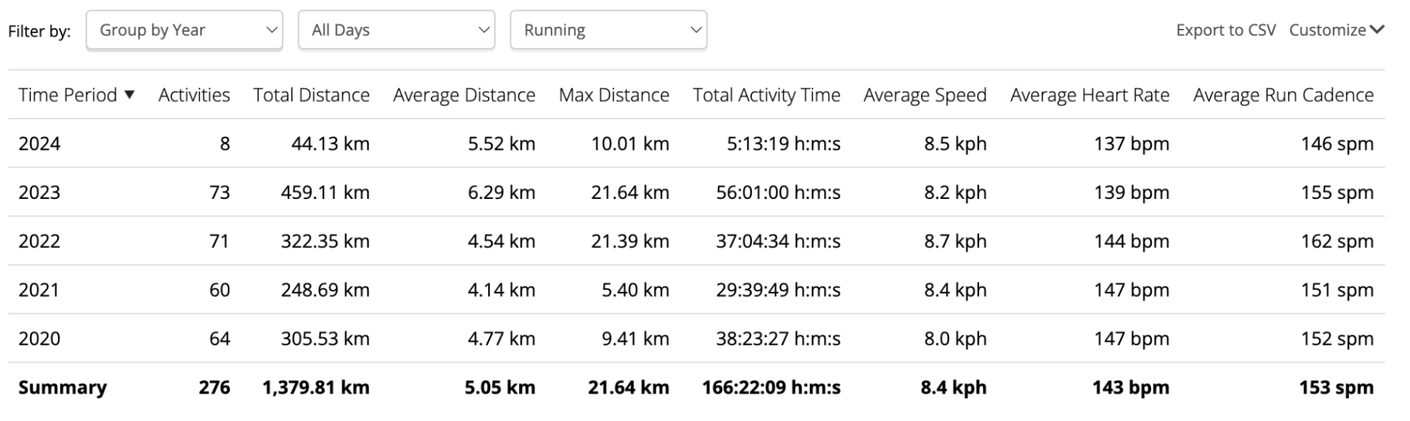 - Running: Similar frequency but a 25% increase in distance, mainly due to trail running.