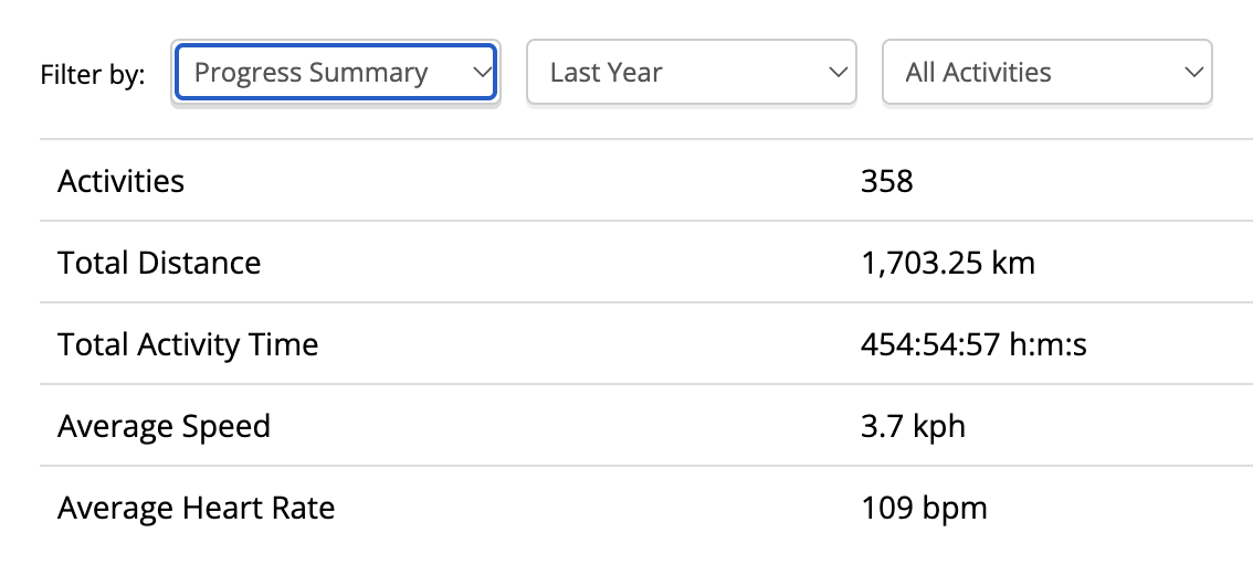 - A total of 358 activities were performed throughout the year, covering 1700 km in 454 hours and 54 minutes—equivalent to 19 days.